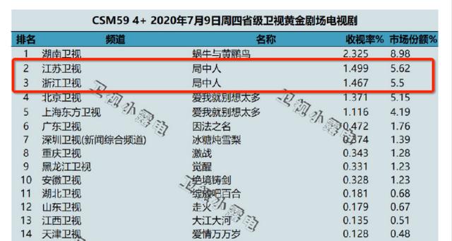 而在52城的数据显示,在最近的一周黄金档的电视剧中,浙江卫视和江苏卫视的《局中人》分别位列收视榜的2、3位。